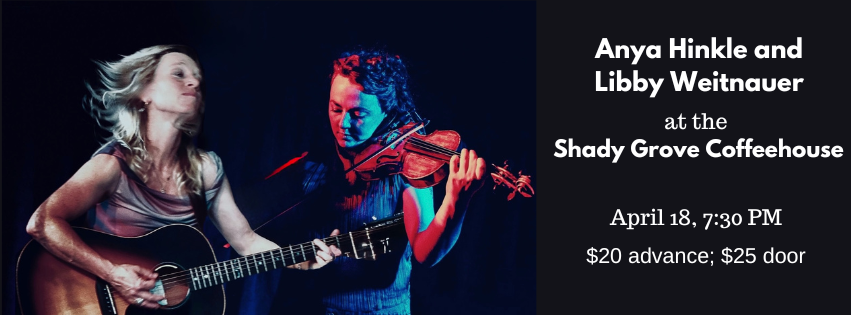 Please join us on Saturday, April 18, as the Shady Grove Coffeehouse welcomes back Anya Hinkle with Libby Weitnauer. Known for their crystalline voices, vivid songwriting, and roots‑rich blend of bluegrass, folk, and Americana, Anya and Libby bring a captivating stage presence that has earned them national acclaim. Whether delivering a driving fiddle tune or a tender ballad, their music is full of heart, storytelling, and Appalachian soul. Their show is an intimate exploration of acoustic music rooted in the sounds of Appalachia and seasoned by travels around the globe. Following international tours in Japan, Europe, and across the US over the past year, the duo will bring their surprisingly dynamic range of styles back home in 2026. Both artists have been awarded prestigious grants for their work: Hinkle was the recipient of the USArtist International grant from the National Endowment for the Arts with her worldgrass trio TANASI in 2025, and Weitnauer was awarded the 2021 Tennessee Arts Commission Grant for her solo project, Sixteen Kings Daughters. Join us for an evening of exceptional musicianship and heartfelt songs as Anya and Libby take the Shady Grove stage. The concert begins at 7:30 PM on March 21 at the Unitarian Universalist Community Church, 11105 Cauthorne Road, Glen Allen, VA 23059. Doors open at 7:00 PM. Tickets are $20 in advance; $25 at the door. Children 12 and under are admitted free of charge; teens 13-18 are admitted at half price. Advance tickets for the performance are available online. Tickets also may be reserved by calling (804) 323-4288 or by emailing tickets@shadygrovecoffeehouse.com. Coffee, tea, and baked goods are available at the performance. Net proceeds benefit UUCC.